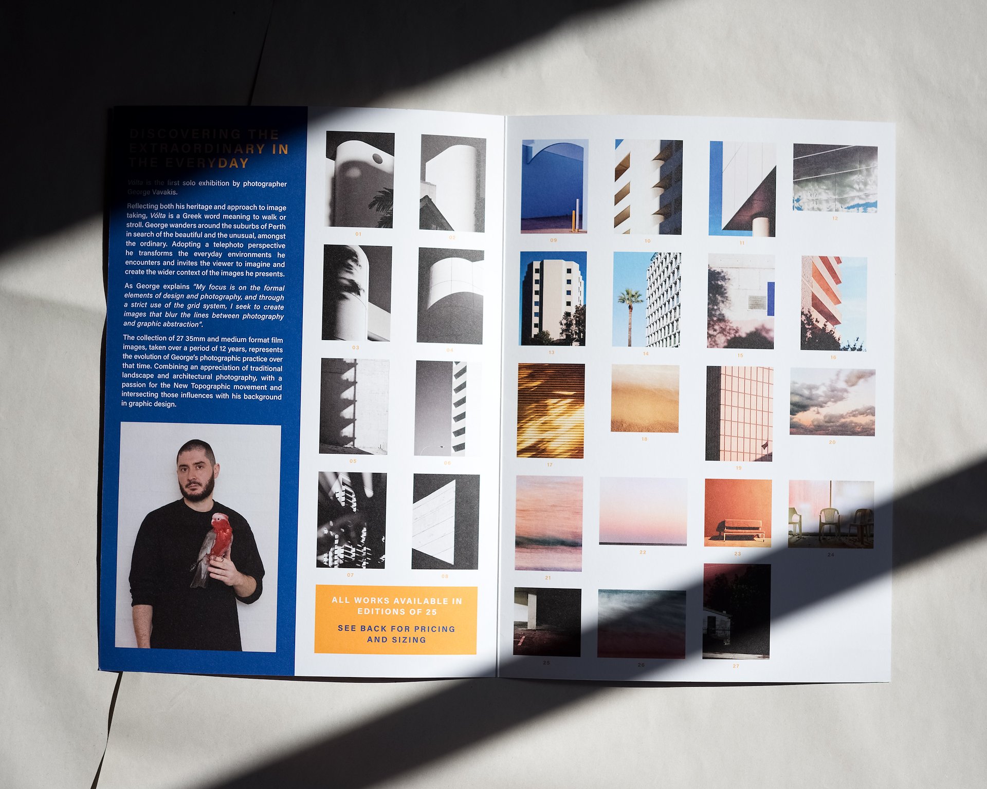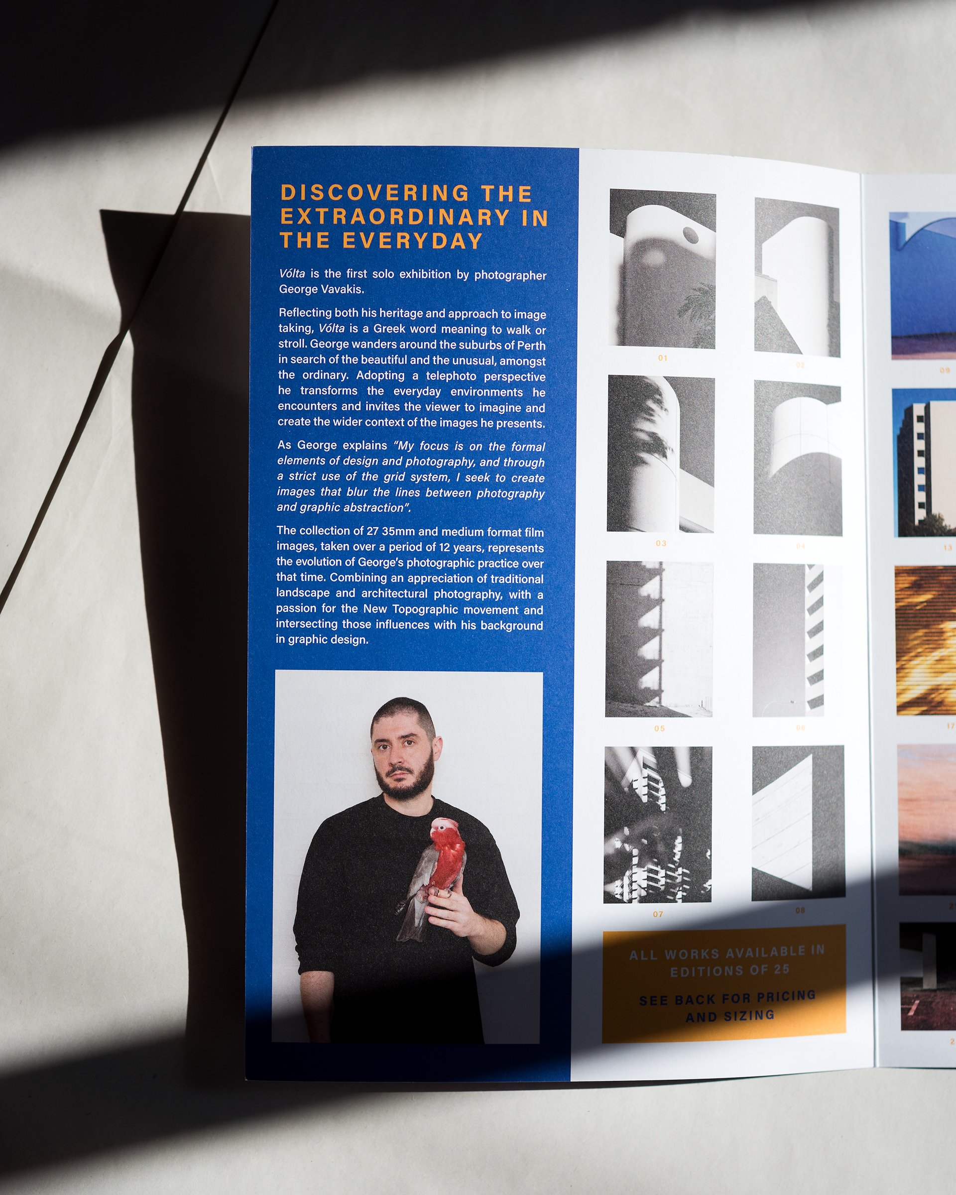 Vólta is my first solo photography exhibition, exploring beauty and intrigue in the everyday. Rooted in my Greek heritage, the title – meaning ‘walk’ or ‘stroll’ – reflects my approach: wandering Perth’s suburbs in search of striking compositions within the ordinary. Using a telephoto perspective, I reframe familiar scenes into graphic abstractions, inviting viewers to imagine the wider context beyond the frame. Spanning 12 years of work on 35mm and medium format film, the series blends influences from landscape photography, the New Topographic movement and my background in graphic design. In addition, I designed the exhibition branding and collateral.