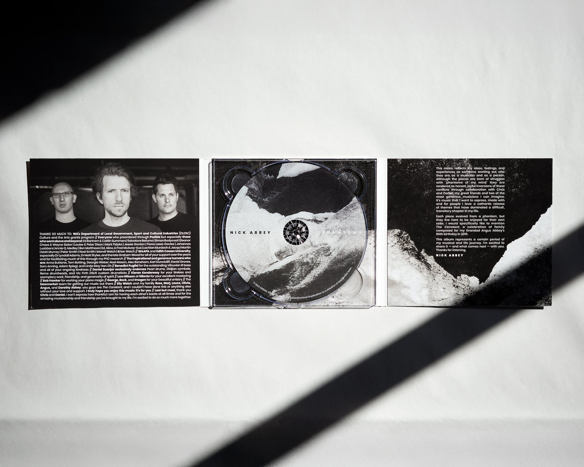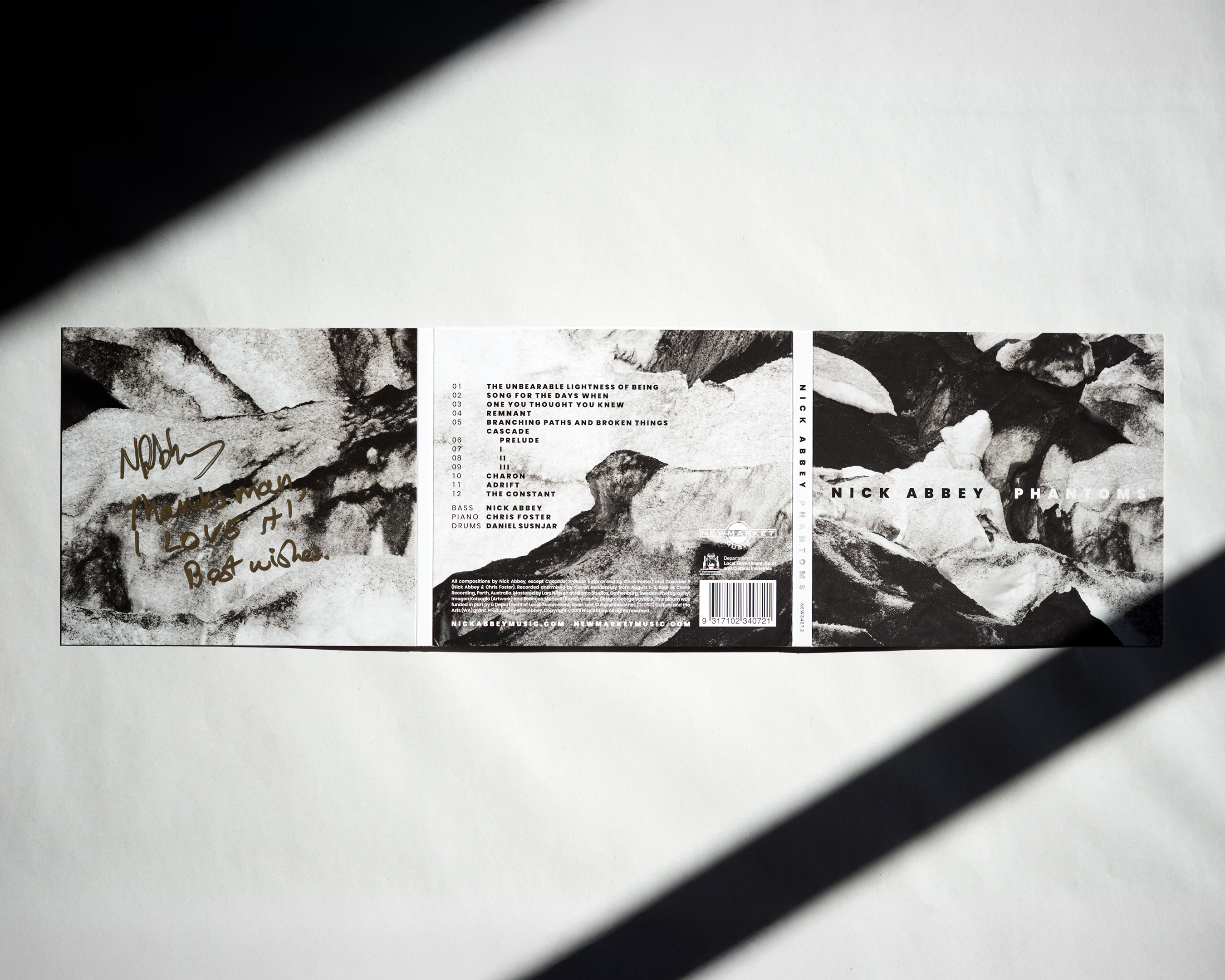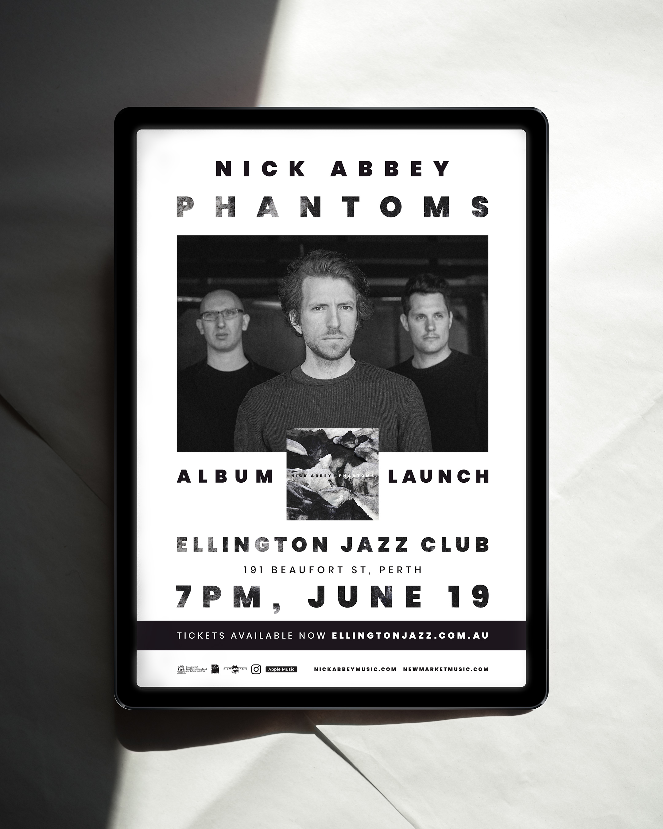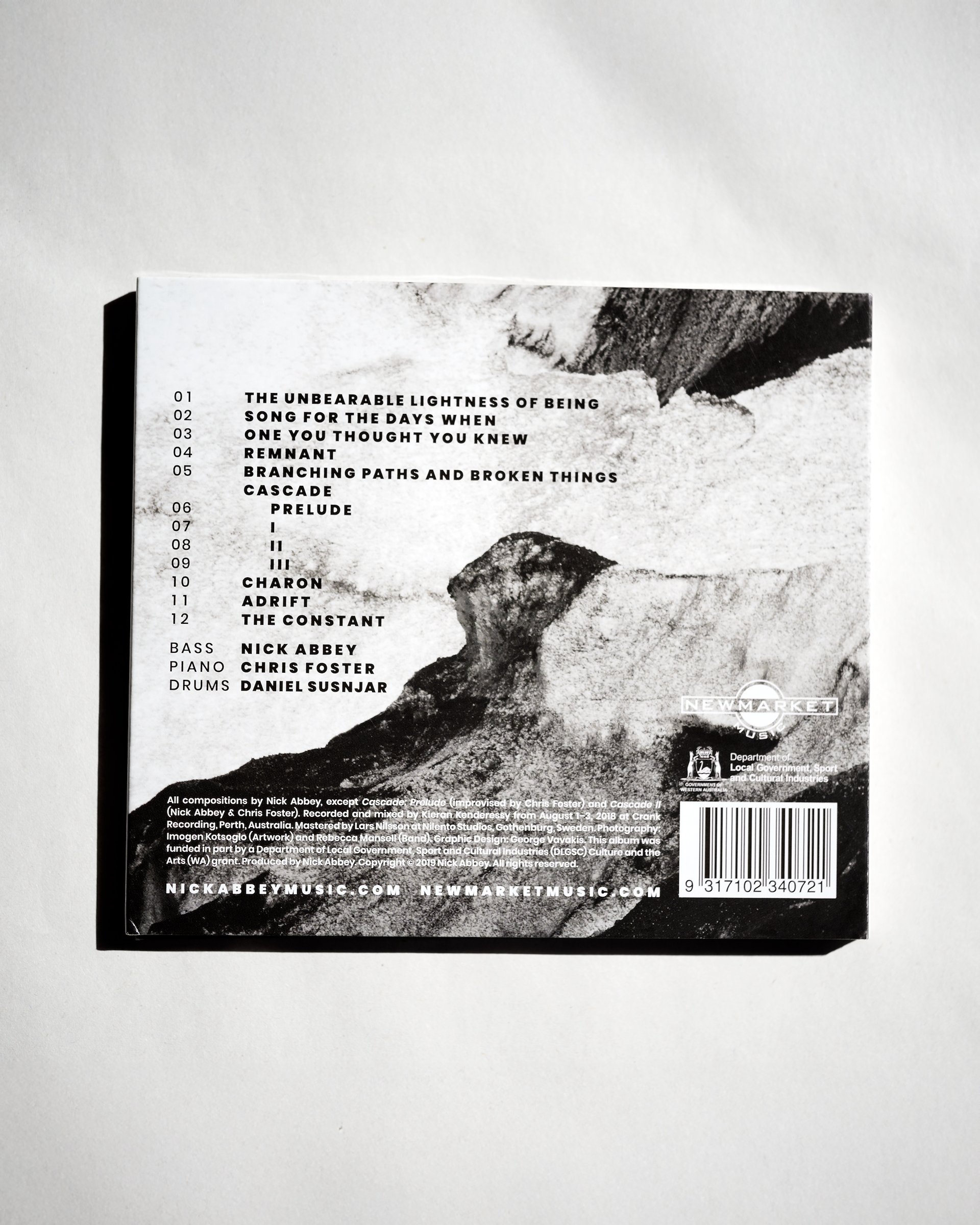 Phantoms is the debut solo album from Perth bassist and composer Nick Abbey, featuring long-time collaborators Chris Foster (piano) and Daniel Susnjar (drums). The artwork reflects the album’s deeply personal themes of introspection, catharsis and connection. The artwork features photography by Imogen Kotsoglo (cover) and Rebecca Mansell (band).